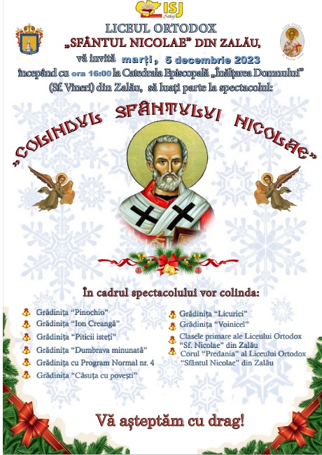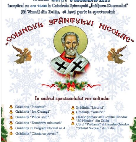 Aflat la a VI-a ediție, “Colindul Sf. Nicolae” adună copiii de la majoritatea grădinițelor din Zalău cu scopul vestirii Nașterii Mântuitorului, marți, 5 decembrie, ora 16, la Catedrala Episcopală “Înălțarea Domnului” din Zalău, la care vă invităm să fiți părtași.