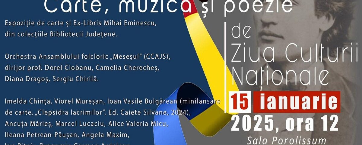 Tot miercuri, de la ora 12.00, Sala Porolissum va găzdui evenimentul „Carte, muzică, poezie de Ziua Culturii Naționale”, organizat de Centrul de Cultura si Arta al Judetului Salaj, Biblioteca Judeţeană „I.S. Bădescu” Sălaj și Direcția Județeană pentru Cultură. Programul cuprinde expoziții și lansări de carte, momente muzicale, recitaluri de poezie, precum și povești ale oamenilor de cultură din Sălaj.