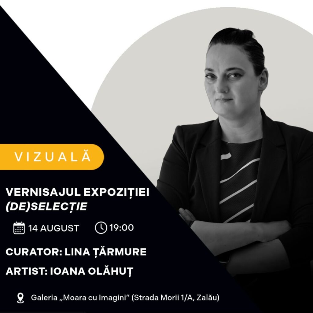 Solo show-ul „(de)selecție” a artistei Ioana Olăhuț continuă programul curatorial al galeriei Moara cu Imagini (str. Morii 1/A, Zalău). Expoziția va avea vernisajul în 14 august și va fi accesibilă publicului până în 26 august, după următorul program: marți, miercuri, joi în intervalul orar 18 – 21 și vineri – sâmbătă între orele 20 – 23:30.