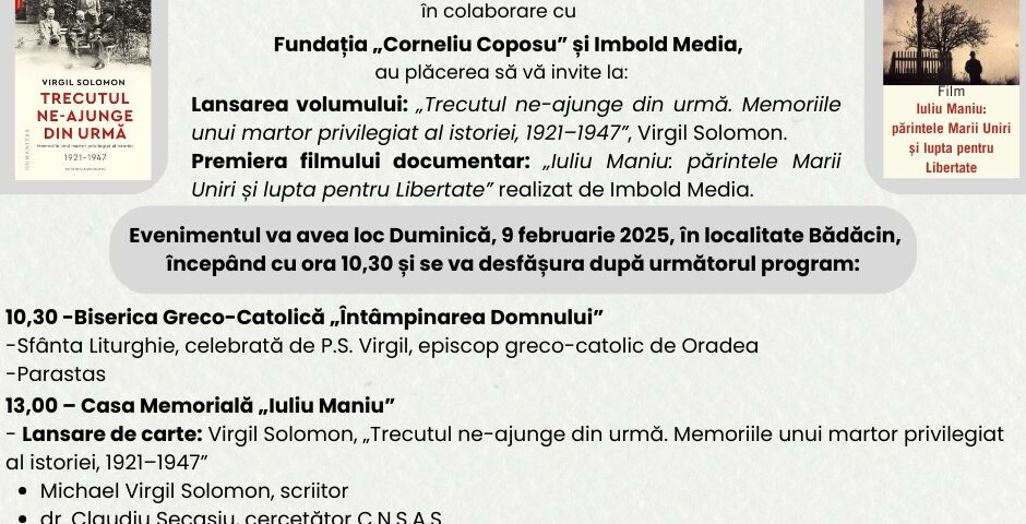La Casa Memorială „Iuliu Maniu” din Bădăcin vă propunem lansarea unui volum inedit de memorii – Virgil Solomon, Trecutul ne-ajunge din urmă. Memoriile unui martor privilegiat al istoriei, 1921–1947 și premiera unui film documentar despre viața și lupta marelui om de stat – Iuliu Maniu: Părintele Marii Uniri și lupta pentru Libertate.
