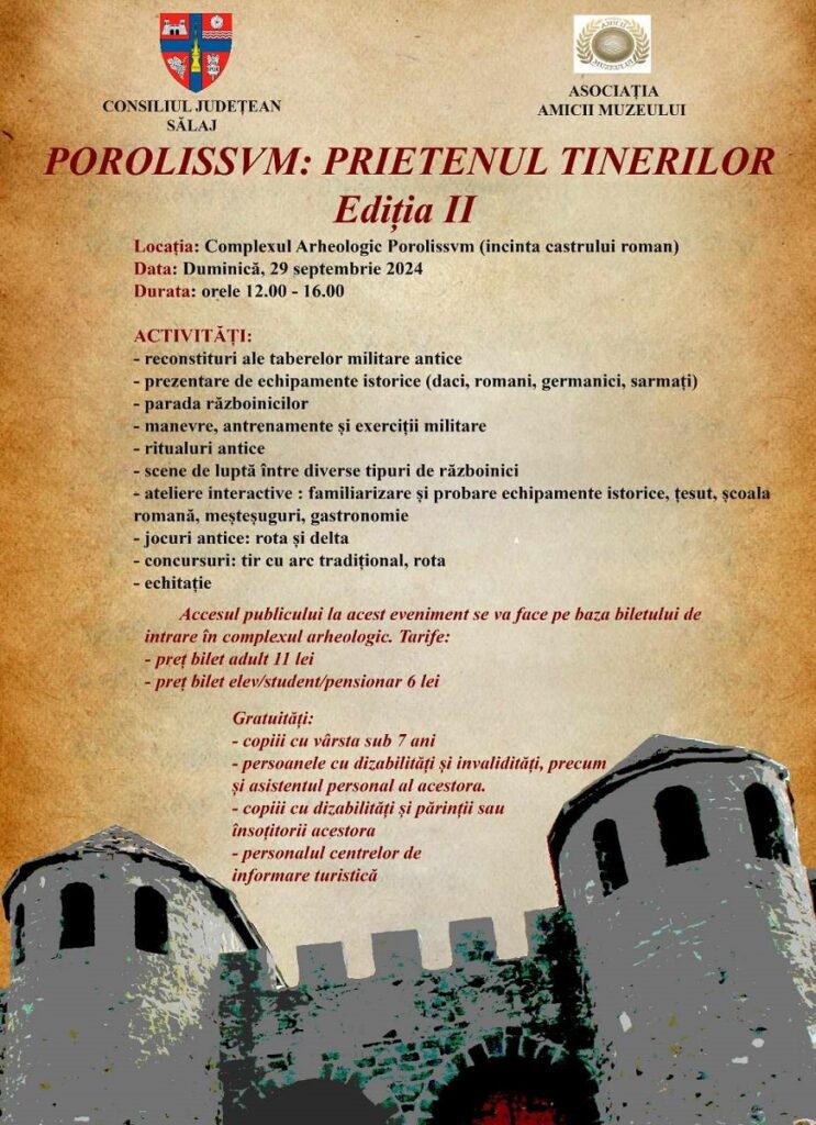 Asociația Amicii Muzeului vă invită la o călătorie în timp, în anticul Porolissum, duminică, 29 septembrie 2024. În cadrul acestui eveniment, legiunile romane se întorc „acasă” printr-o serie de activități de reconstituire istorică destinate publicului larg, în special tinerilor. Evenimentul face parte din proiectul „Porolissvm: prietenul tinerilor”, ediția a II-a, finanțat de Consiliul Județean Sălaj, și are drept scop promovarea patrimoniului istoric antic din județul Sălaj.