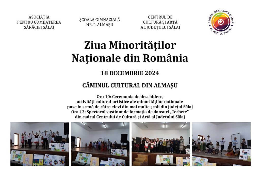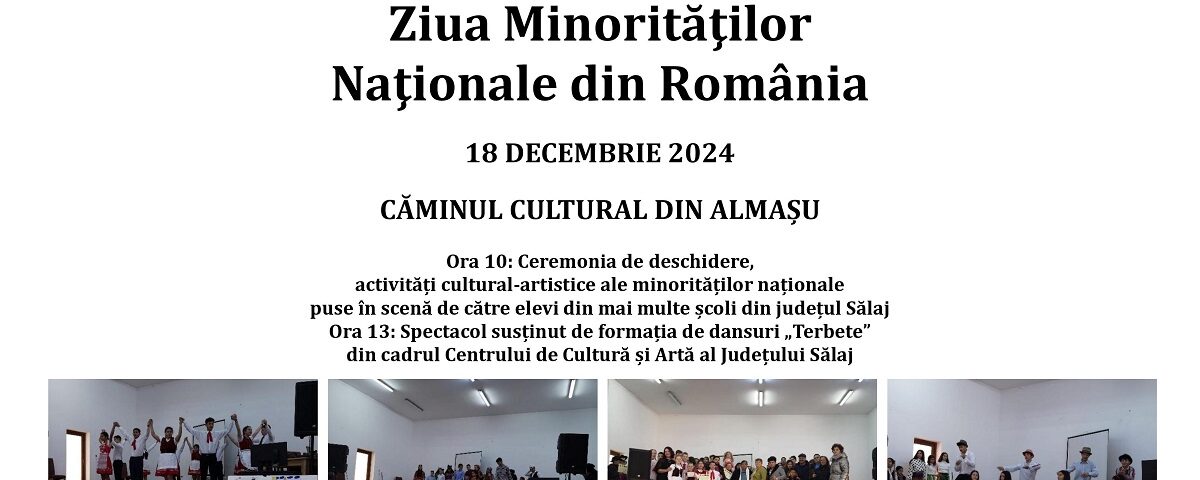 Asociația pentru Combaterea Sărăciei Sălaj, Şcoala Gimnazială Nr. 1 Almaşu și Centrul de Cultură și Artă al Județului Sălaj organizează o manifestare cultural-artistică prilejuită de Ziua Minorităţilor Naţionale din România. Evenimentul va avea loc în 18 decembrie 2024, cu începere de la ora 10, locul de desfăşurare fiind Căminul Cultural din Almașu. După ceremonia de deschidere a manifestării, se vor desfăşura activități cultural-artistice ale minorităților naționale puse în scenă de către elevi din mai multe școli din județul Sălaj. De la ora 13, formația de dansuri „Terbete” din cadrul Centrului de Cultură și Artă al Județului Sălaj va susține un spectacol cultural-artistic inspirat din obiceiurile minorităților naționale.