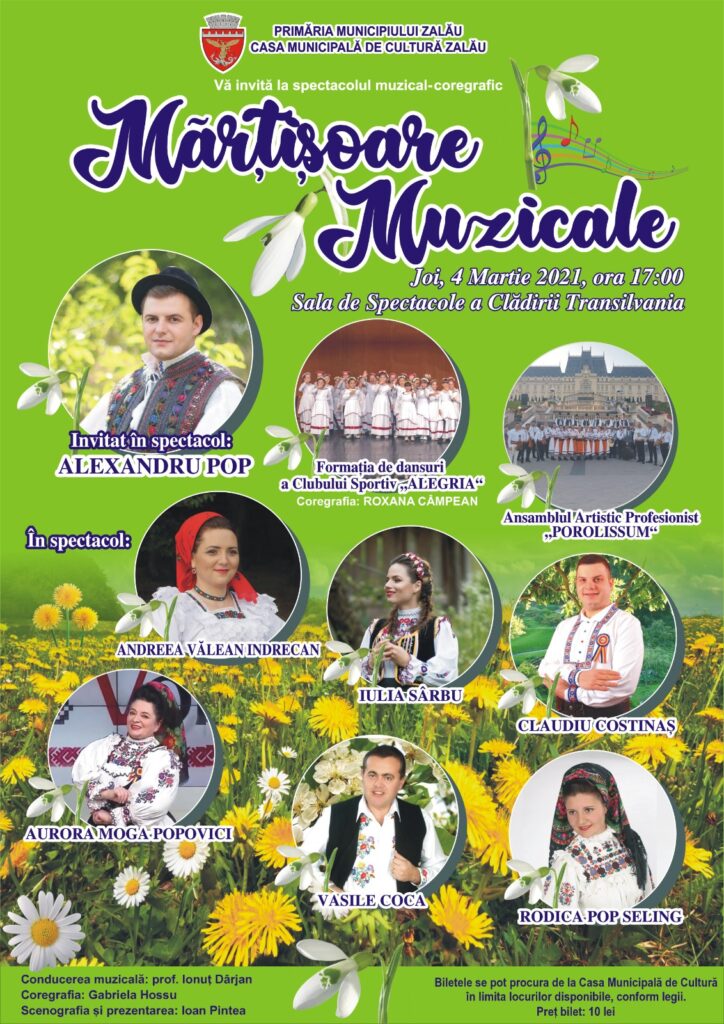 Primăria Municipiului Zalău, prin Casa Municipală de Cultură, organizează joi, 4 martie, începând cu ora 17.00, în sala festivă din Clădirea Transilvania, spectacolul muzical-coregrafic “Mărțișoare muzicale”.