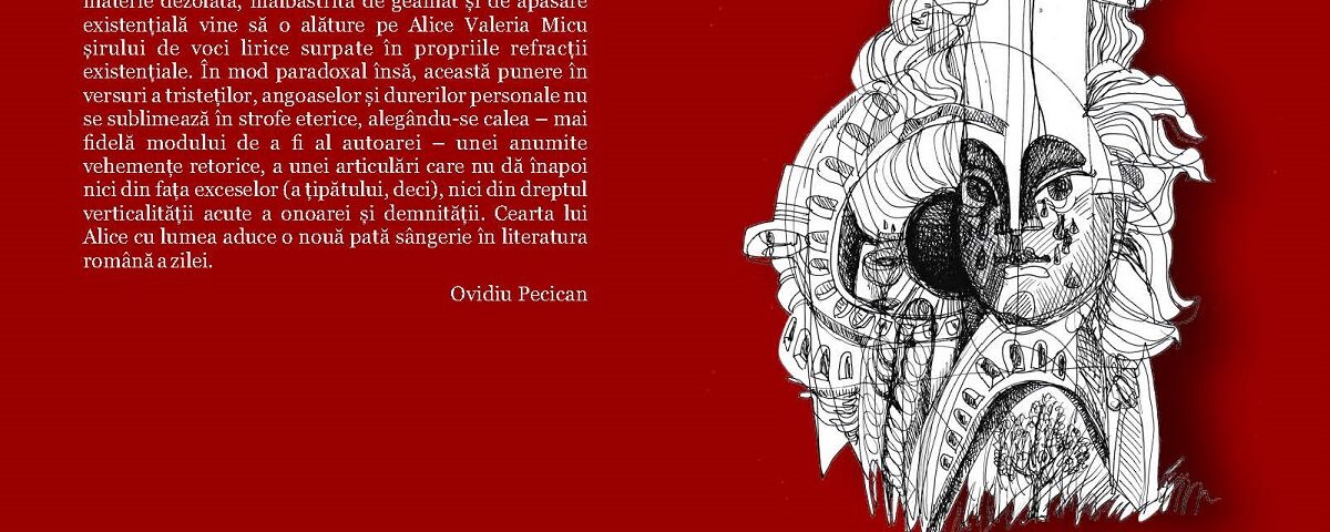 O poezie adâncită în sine, hrănită din propria materie dezolată, înălbăstrită de geamăt și de apăsare existențială vine să o alăture pe Alice Valeria Micu șirului de voci lirice surpate în propriile refracții existențiale. În mod paradoxal însă, această punere în versuri a tristeților, angoaselor și durerilor personale nu se sublimează în strofe eterice, alegându-se calea – mai fidelă modului de a fi al autoarei – unei anumite vehemențe retorice, a unei articulări care nu dă înapoi nici din fața exceselor (a țipătului, deci), nici din dreptul verticalității acute a onoarei și demnității. Cearta lui Alice cu lumea aduce o nouă pată sângerie în literatura română a zilei.