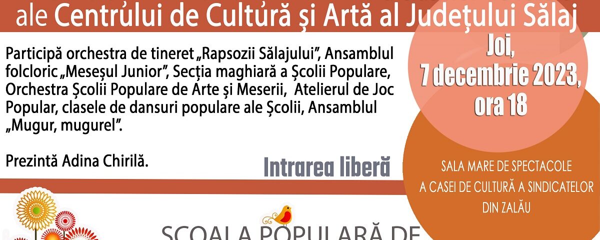 Joi, 7 decembrie 2023, ora 18, sala mare de spectacole a Casei de Cultură a Sindicatelor din Zalău. Intrarea liberă.