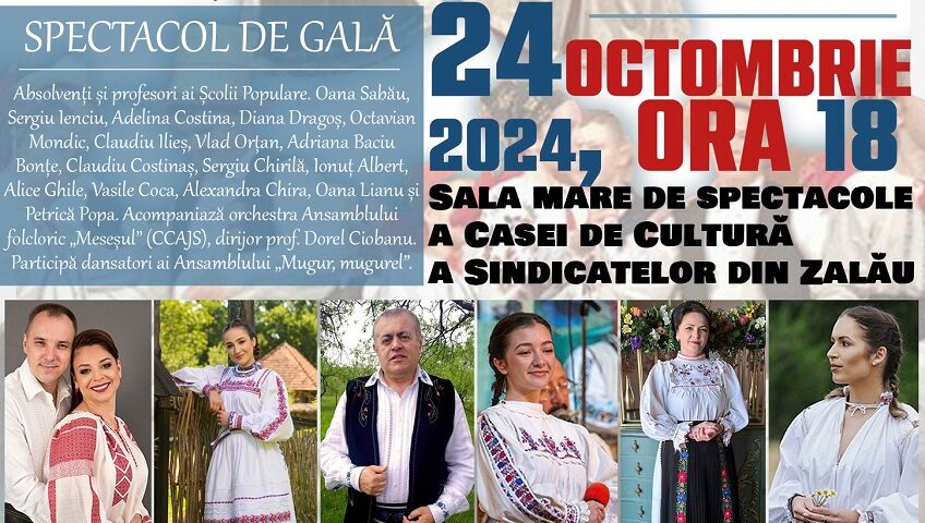 24 octombrie 2024, ora 18, Sala mare de spectacole a Casei de Cultură a Sindicatelor din Zalău, intrarea liberă. SPECTACOL DE GALĂ. Absolvenți și profesori ai Școlii Populare. Oana Sabău, Sergiu Ienciu, Adelina Costina, Diana Dragoș, Octavian Mondic, Claudiu Ilieș, Vlad Orțan, Adriana Baciu Bonțe, Claudiu Costinaș, Sergiu Chirilă, Ionuț Albert, Alice Ghile, Vasile Coca, Alexandra Chira, Oana Lianu și Petrică Popa. Acompaniază orchestra Ansamblului folcloric „Meseșul” (CCAJS), dirijor prof. Dorel Ciobanu. Participă dansatori ai Ansamblului „Mugur, mugurel”. Prezintă Diana Dragoș.