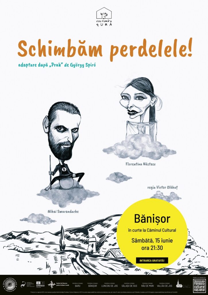 Vara teatrală sălăjeană începe mâine, 15 iunie, ora 21:30, la Bănișor. Cultură‘n Șură, alături de partenerul tradițional al proiectului, Centrul de Cultură și Artă al Județului Sălaj, va prezenta comedia „Schimbăm perdele” în curte la Căminul Cultural. Intrarea pentru spectatori este gratuită!