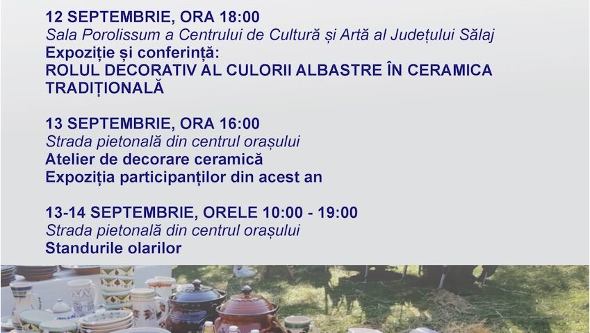 În cadrul evenimentului „Haidaț’ pă la noi”, susținut de Primăria Municipiului Zalău, va avea loc și în acest an Târgul olarilor la Zalău, în zilele de 13-14 septembrie 2025, eveniment oferit de Centrul de Cultură și Artă al Județului Sălaj. Ca și anii trecuți, programul mai cuprinde și o conferință tematică cu acces liber pentru public, intitulată Rolul decorativ al culorii albastre în ceramica tradițională, prezentările fiind susținute de etnografi și specialiști ai ceramicii populare, derulându-se vineri, 12 septembrie de la ora 18:00 la sala Porolissum a Centrului de Cultură și Artă (lângă Prefectură). Conferința va avea un stand de expoziție cu piese ceramice de colecție ce ilustrează tematica prin aspecte sălăjene: ceramica de Zalău, Deja și de Șimleu Silvaniei.