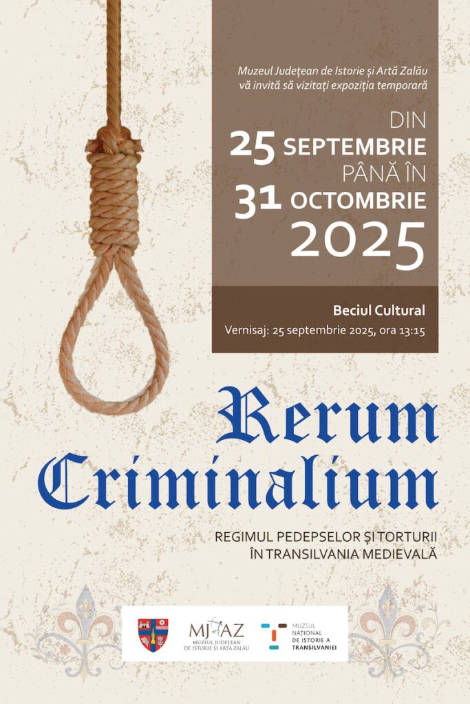 Muzeul Județean de Istorie și Artă Zalău, instituție subordonată Consiliului Județean Sălaj, organizează vernisajul expoziției temporare „Rerum Criminalium. Regimul pedepselor și torturii în Transilvania medievală”, joi, 25 septembrie 2025, la ora 13,15, în Beciul Cultural.