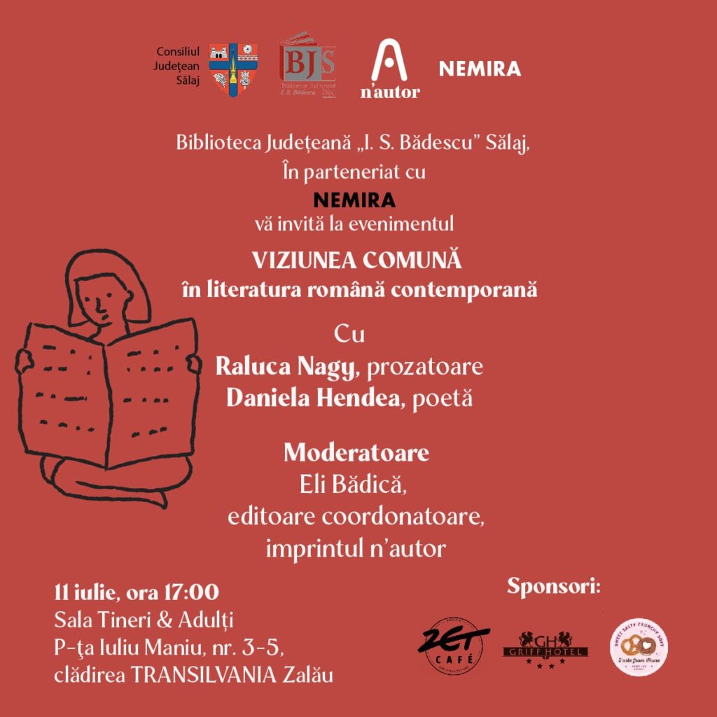Biblioteca Județeană „I.S Bădescu”, instituție de cultură aflată în subordinea Consiliului Județean Sălaj și Editura NEMIRA, își invită cititorii și prietenii la unul dintre cele mai așteptate evenimente literare ale verii: Viziunea Comună în literatura română contemporană, cu Raluca Nagy – prozatoare și Daniela Hendea – poetă.