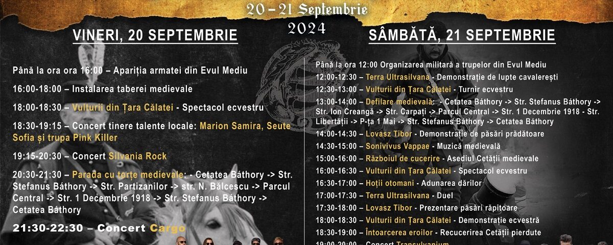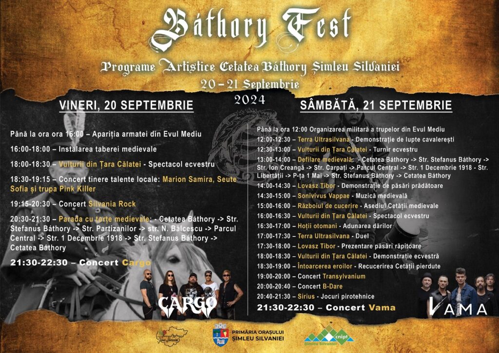 Vă adresăm invitația de a participa la a IX-a ediţie a “Báthory Fest”- Festivalul de reconstituire medievală bazat pe istoria Cetății Şimleu Silvaniei, eveniment de promovare a valorilor istorice și culturale, care se va desfășura în perioada 20-21 septembrie 2024.