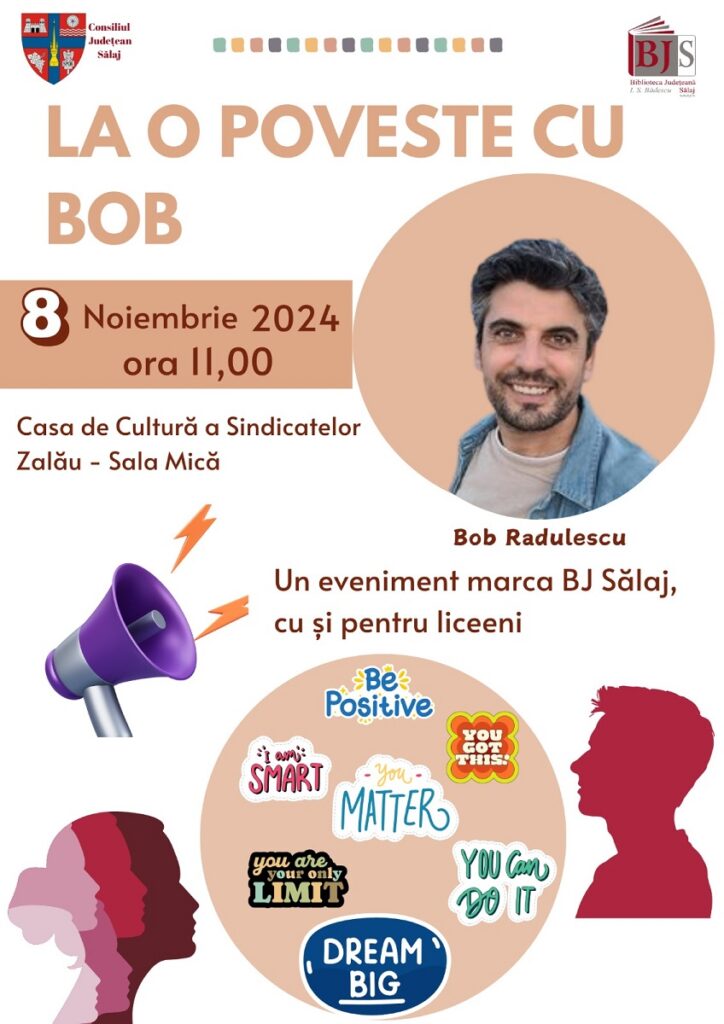 Biblioteca Județeană „I.S. Bădescu” Sălaj, instituție de cultură aflată în subordinea Consiliului Județean Sălaj, vă invită la unul dintre cele mai frumoase evenimente ale toamnei: La o poveste cu Bob, al cărui invitat special va fi Bogdan Bob Rădulescu, actor, speaker motivațional, lider civic și cetățean activ, cu un angajament deosebit în cauzele comunitare, ecologice și umanitare.