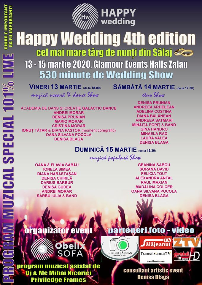 Vă propunem un program artistic special în cadrul evenimentului Happy Wedding 4th edition, cel mai mare târg de nunți din Sălaj. Toți acești artiști pot performa LIVE chiar la nunta ta sau la orice alte evenimente cu adevărat importante. Ei chiar sunt rețeta concretă pentru o atmosferă reușită. Îți dorești asta? Perfect! Vino să-i vezi și o să ne crezi. Ți-am pregătit 3 zile incredibile!