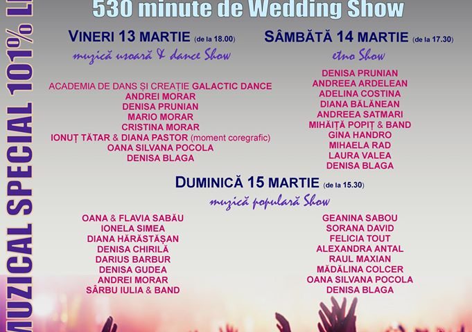 Vă propunem un program artistic special în cadrul evenimentului Happy Wedding 4th edition, cel mai mare târg de nunți din Sălaj. Toți acești artiști pot performa LIVE chiar la nunta ta sau la orice alte evenimente cu adevărat importante. Ei chiar sunt rețeta concretă pentru o atmosferă reușită. Îți dorești asta? Perfect! Vino să-i vezi și o să ne crezi. Ți-am pregătit 3 zile incredibile!