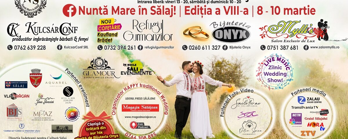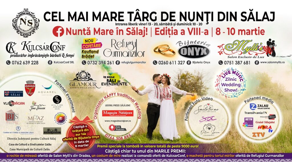 În perioada 8 – 10 martie va avea loc la Glamour Events Halls Zalău, în noile săli de evenimente, cel mai mare târg de nunți din județul Sălaj, „Nuntă mare în Sălaj!”, organizat de cotidianul Magazin Sălăjean. Expozanți renumiți din toată Transilvania îi așteaptă pe vizitatori cu reduceri importante de preț și oferte unice, valabile doar la târg. Poți cumpăra produsele de care ai nevoie pentru toate evenimentele tale speciale (nuntă, botez, majorat, aniversări, evenimente corporate etc) și îți poți achiziționa lucruri utile pentru sărbătorile pascale. În plus, vei avea parte și de o serie de degustări la numeroase produse: prăjituri apetisante, vin, vin spumant, aperitive, cocktailuri și multe altele. În plus, în fiecare zi pe scena evenimentului vor urca artiști importanți, astfel că distracția este garantată. La Info Point te vei înscrie gratuit la tombola evenimentului cu premii în valoare totală de peste 9000 euro, extragerile urmând să aibă loc în fiecare seară.