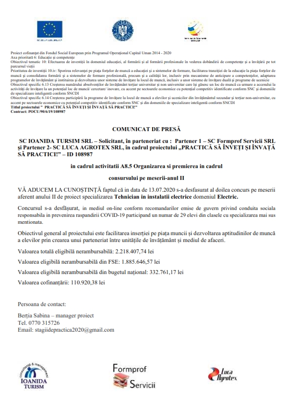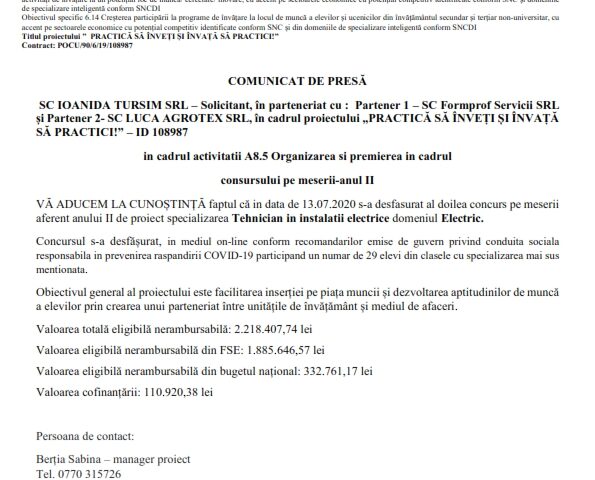 SC IOANIDA TURISM SRL, -Solicitant, în parteneriat cu: Partener 1 – SC Formprof Servicii SRL și Partener 2 – SC LUCA AGROTEX SRL, în cadrul proiectului ”PRACTICĂ SĂ ÎNVEȚI ȘI ÎNVAȚĂ SĂ PRACTICI!„ – ID 108987 , in cadrul activitatii A8.5 Organizarea si premierea in cadrul concursului pe meserii-anul II