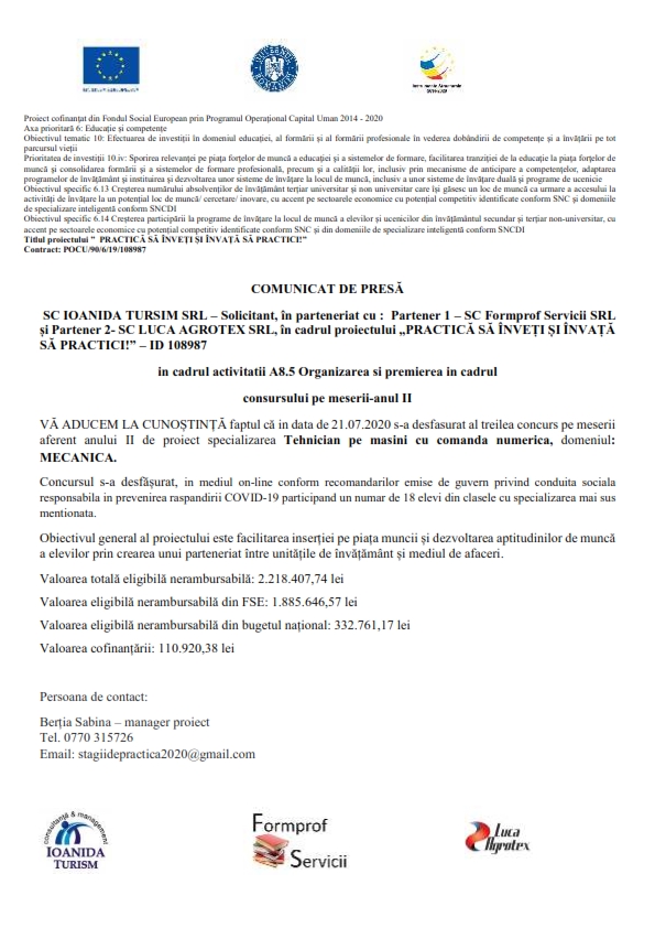 SC IOANIDA TURISM SRL, -Solicitant, în parteneriat cu: Partener 1 – SC Formprof Servicii SRL și Partener 2 – SC LUCA AGROTEX SRL, în cadrul proiectului ”PRACTICĂ SĂ ÎNVEȚI ȘI ÎNVAȚĂ SĂ PRACTICI!„ – ID 108987 , in cadrul activitatii A8.5 Organizarea si premierea in cadrul concursului pe meserii-anul II