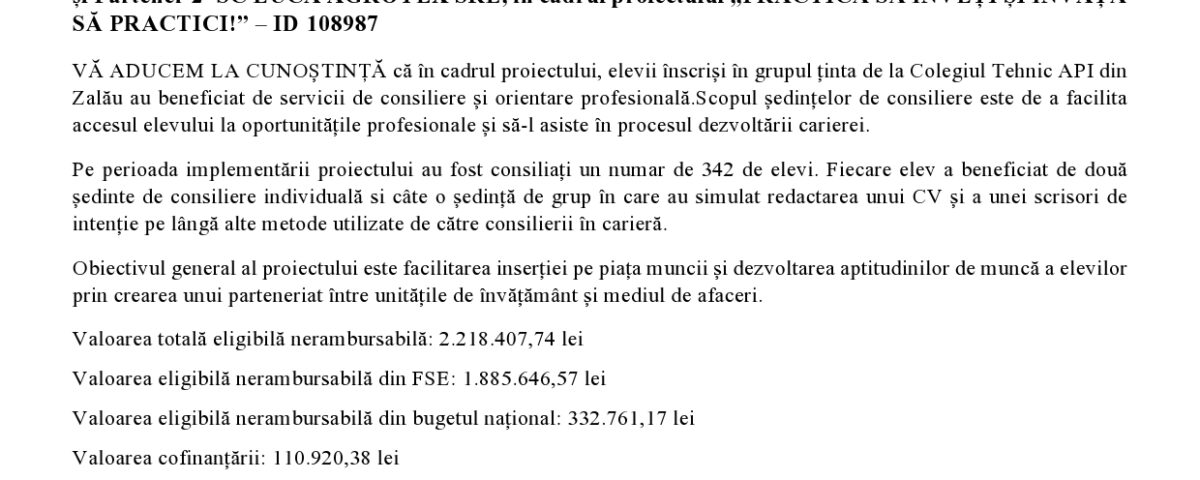 In cadrul proiectului, elevii inscrisi in grupul tinta de la Colegiul Tehnic API din Zalau au beneficiat de servicii de consiliere si orientare profesionala.