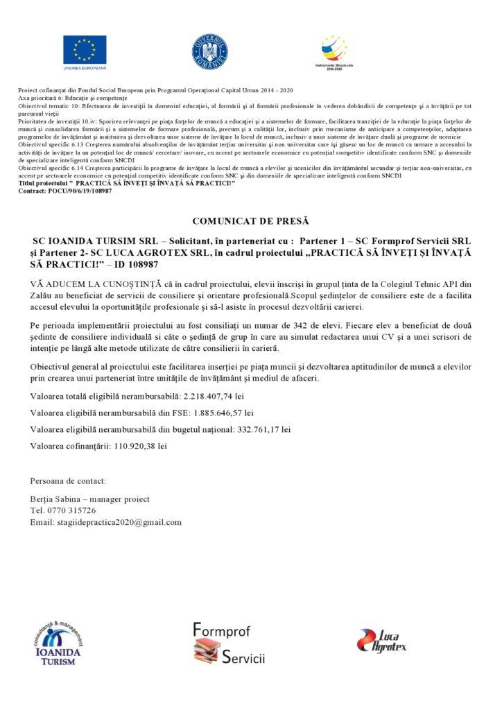SC IOANIDA TURISM SRL – Solicitant, în parteneriat cu Partener 1 – SC Formpro Servicii SRL și Partener 2 – SC LUCA AGROTEX SRL, în cadrul proiectului PRACTICĂ SĂ ÎNVEȚI ȘI INVAȚĂ SĂ PRACTICI – ID 108987