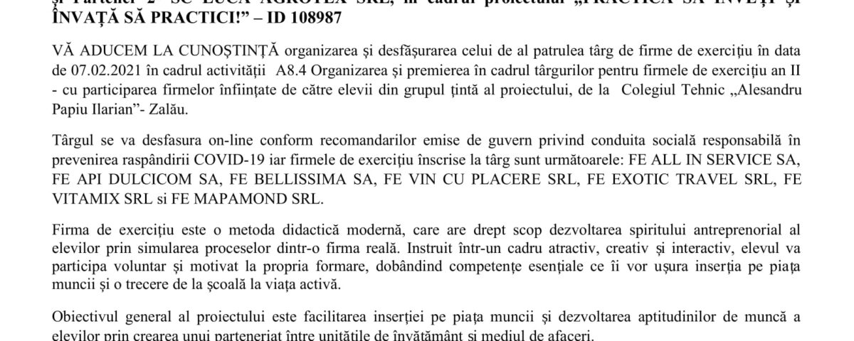 Organizarea si desfasurarea celui de al patrulea targ de firme de exercitiu in data de 07.02.2021 in cadrul activitatii