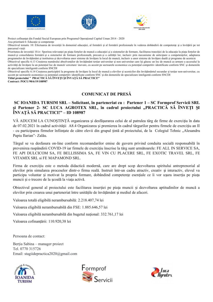 SC IOANIDA TURISM SRL – Solicitant, în parteneriat cu Partener 1 – SC Formpro Servicii SRL și Partener 2 – SC LUCA AGROTEX SRL, în cadrul proiectului PRACTICĂ SĂ ÎNVEȚI ȘI INVAȚĂ SĂ PRACTICI – ID 108987