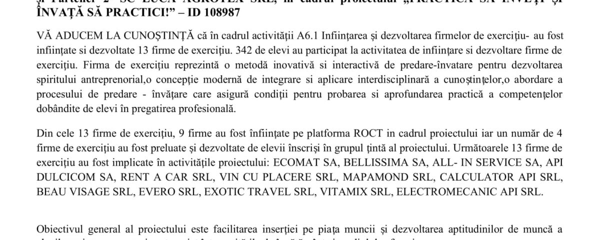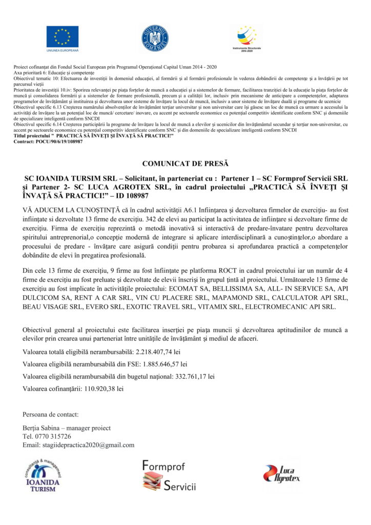SC IOANIDA TURISM SRL – Solicitant, în parteneriat cu Partener 1 – SC Formpro Servicii SRL și Partener 2 – SC LUCA AGROTEX SRL, în cadrul proiectului PRACTICĂ SĂ ÎNVEȚI ȘI INVAȚĂ SĂ PRACTICI – ID 108987