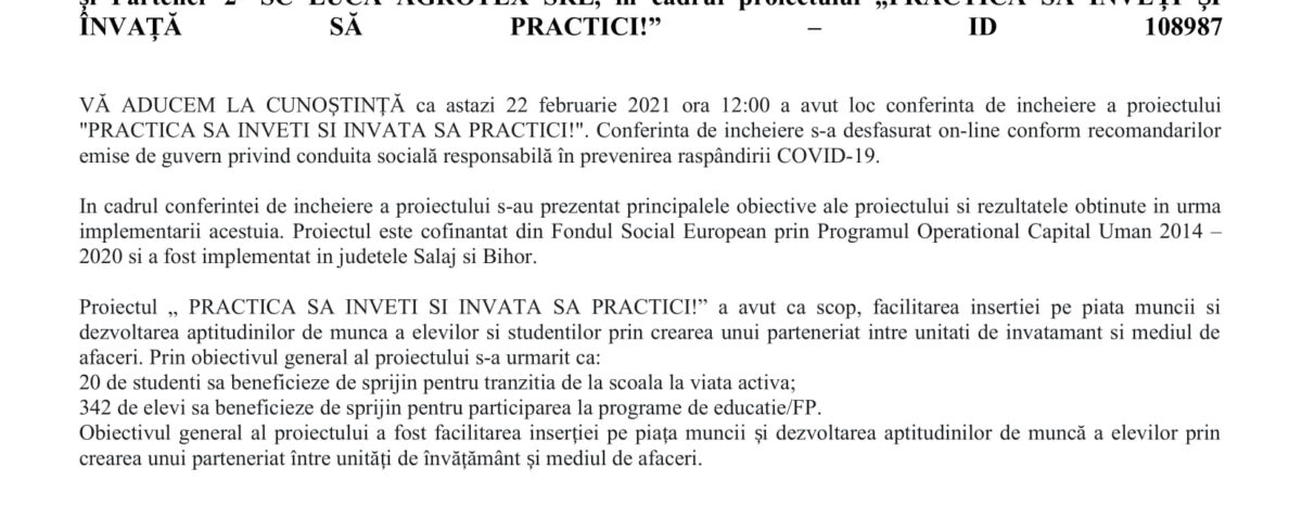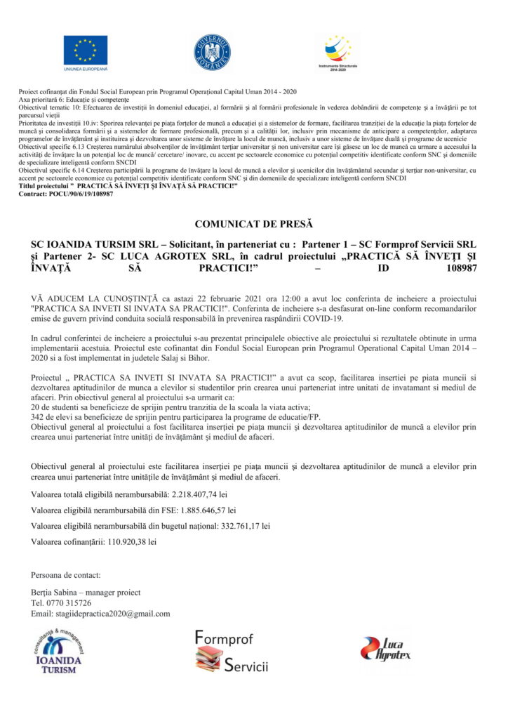 SC IOANIDA TURISM SRL – Solicitant, în parteneriat cu Partener 1 – SC Formpro Servicii SRL și Partener 2 – SC LUCA AGROTEX SRL, în cadrul proiectului PRACTICĂ SĂ ÎNVEȚI ȘI INVAȚĂ SĂ PRACTICI – ID 108987