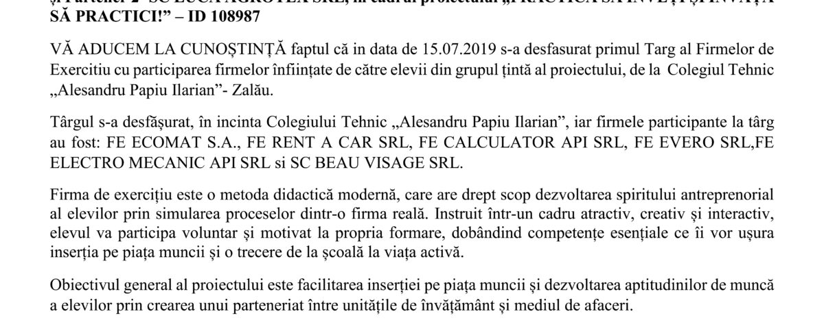 SC IOANIDA TURISM SRL – Solicitant, în parteneriat cu Partener 1 – SC Formpro Servicii SRL și Partener 2 – SC LUCA AGROTEX SRL, în cadrul proiectului PRACTICĂ SĂ ÎNVEȚI ȘI INVAȚĂ SĂ PRACTICI – ID 108987