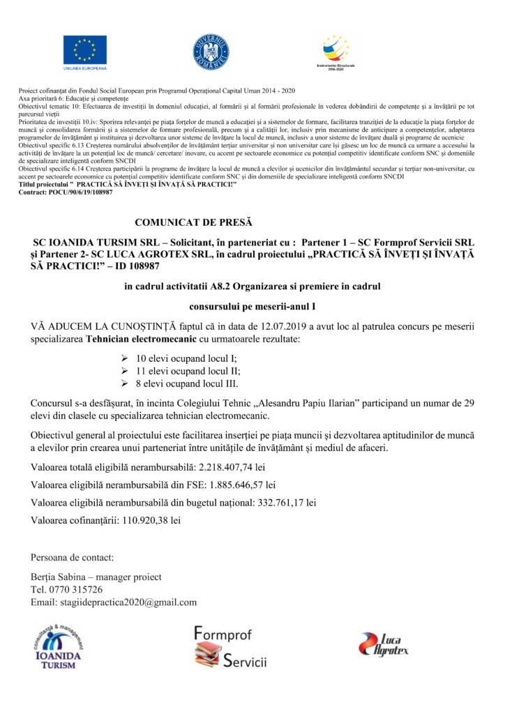 SC IOANIDA TURISM SRL, -Solicitant, în parteneriat cu Partener 1 – SC Formprof Servicii SRL și partener 2 – SC LUCA AGROTEX SRL, în cadrul proiectului ”PRACTICĂ SĂ ÎNVEȚI ȘI ÎNVAȚĂ SĂ PRACTICI!„ – ID 108987 în cadrul activității A8.2 Organizarea și premierea în cadrul concursului pe meserii anul I