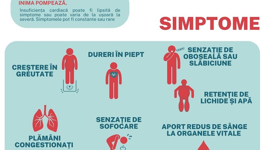 Simptomele insuficienței cardiace pot varia de la ușoare la severe, și includ: