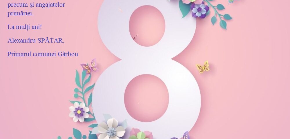Cu ocazia zilei de 8 Martie, Ziua Internaţională a Femeii, adresez cele mai alese gânduri de bine și prosperitate doamnelor și domnişoarelor din comuna Gârbou, colaboratoarelor noastre, precum și angajatelor primăriei.