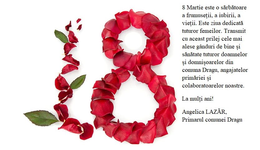 8 Martie este o sărbătoare a frumuseţii, a iubirii, a vieţii. Este ziua dedicată tuturor femeilor. Transmit cu aceast prilej cele mai alese gânduri de bine și sănătate tuturor doamnelor și domnișoarelor din comuna Dragu, angajatelor primăriei și colaboratoarelor noastre.