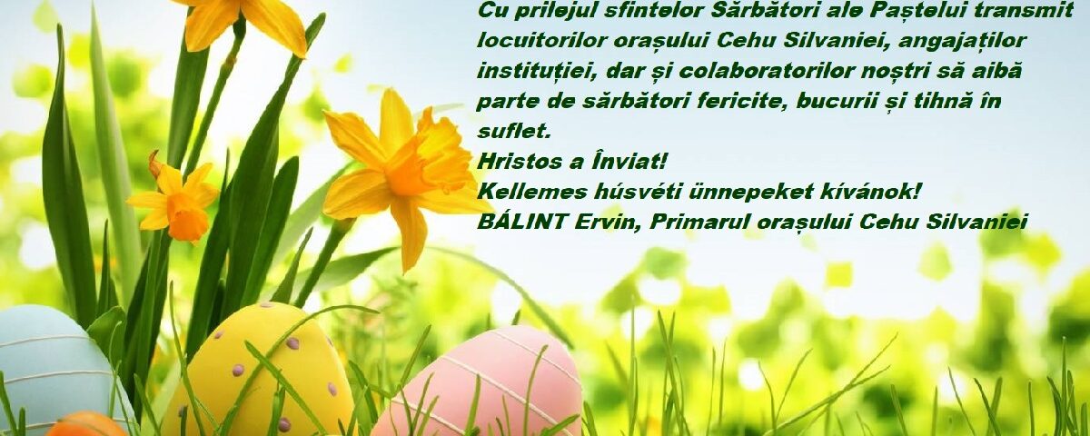 Cu prilejul sfintelor Sărbători ale Paștelui transmit locuitorilor orașului Cehu Silvaniei, angajaților instituției, dar și colaboratorilor noștri să aibă parte de sărbători fericite, bucurii și tihnă în suflet.