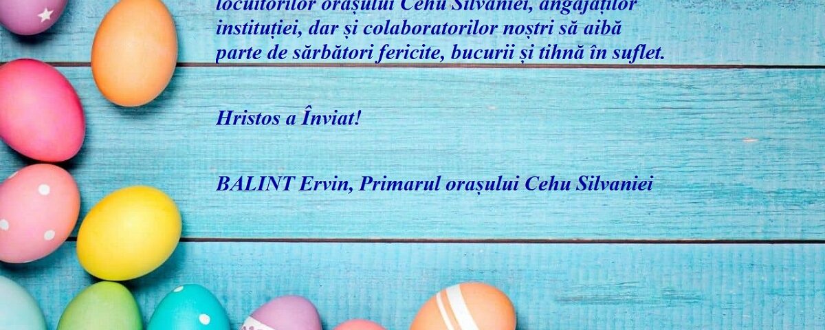 Cu prilejul sfintelor Sărbători ale Paștelui transmit locuitorilor orașului Cehu Silvaniei, angajaților instituției, dar și colaboratorilor noștri să aibă parte de sărbători fericite, bucurii și tihnă în suflet.