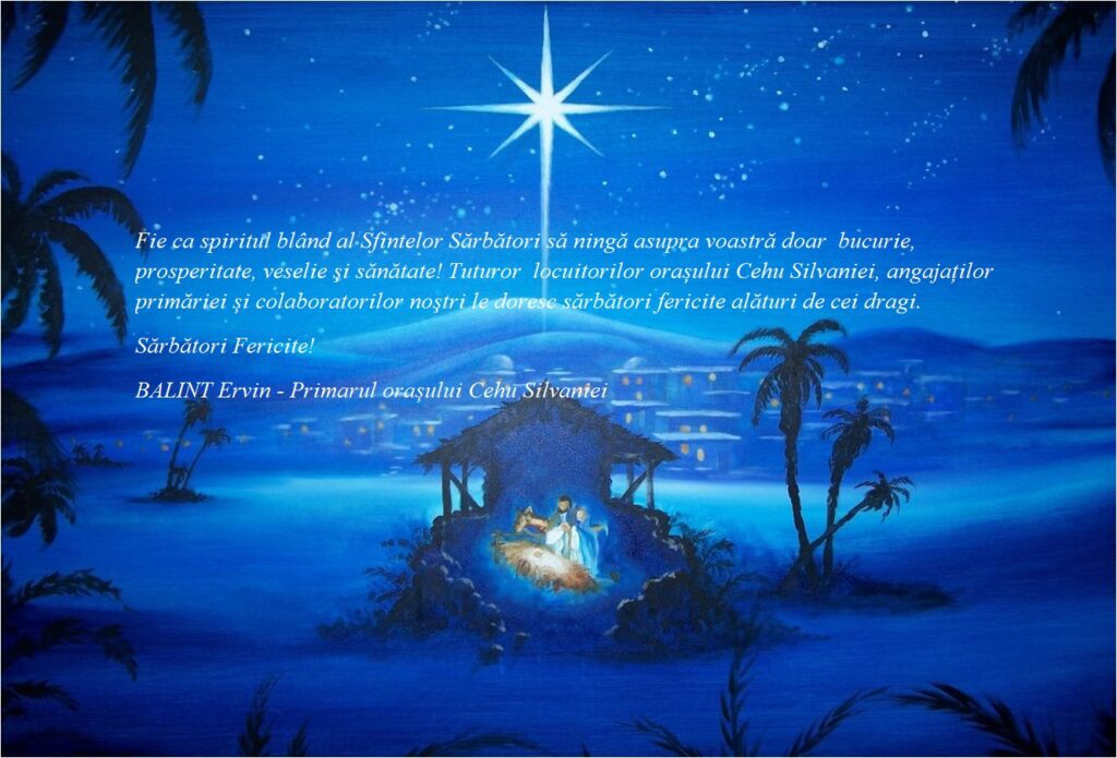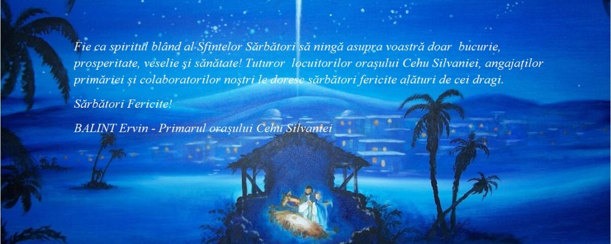 Fie ca spiritul blând al Sfintelor Sărbători să ningă asupra voastră doar bucurie, prosperitate, veselie şi sănătate! Tuturor locuitorilor orașului Cehu Silvaniei, angajaților primăriei și colaboratorilor noştri le doresc sărbători fericite alături de cei dragi.