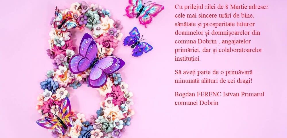 Cu prilejul zilei de 8 Martie adresez cele mai sincere urări de bine, sănătate și prosperitate tuturor doamnelor și domnișoarelor din comuna Dobrin , angajatelor primăriei, dar și colaboratoarelor instituției.