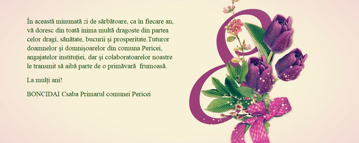 În această minunată zi de sărbătoare, ca în fiecare an, vă doresc din toată inima multă dragoste din partea celor dragi, sănătate, bucurii și prosperitate.Tuturor doamnelor și domnișoarelor din comuna Pericei, angajatelor instituției, dar și colaboratoarelor noastre le transmit să aibă parte de o primăvară frumoasă.