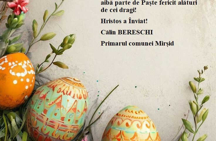 Sfânta sărbătoare de Paște este un moment în care dragostea, pacea și seninătatea se unesc în numele Domnului. Tuturor locuitorilor comunei Mirșid, angajaților primăriei, precum și colaboratorilor noștri le doresc să aibă parte de Paște fericit alături de cei dragi!