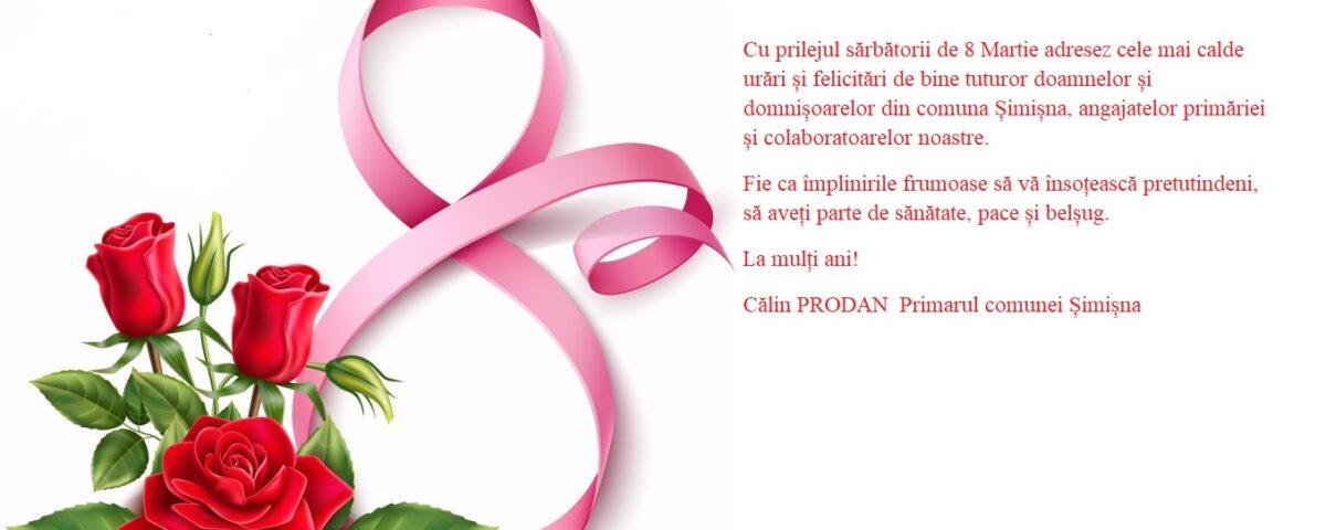 Cu prilejul sărbătorii de 8 Martie adresez cele mai calde urări și felicitări de bine tuturor doamnelor și domnișoarelor din comuna Șimișna, angajatelor primăriei și colaboratoarelor noastre.