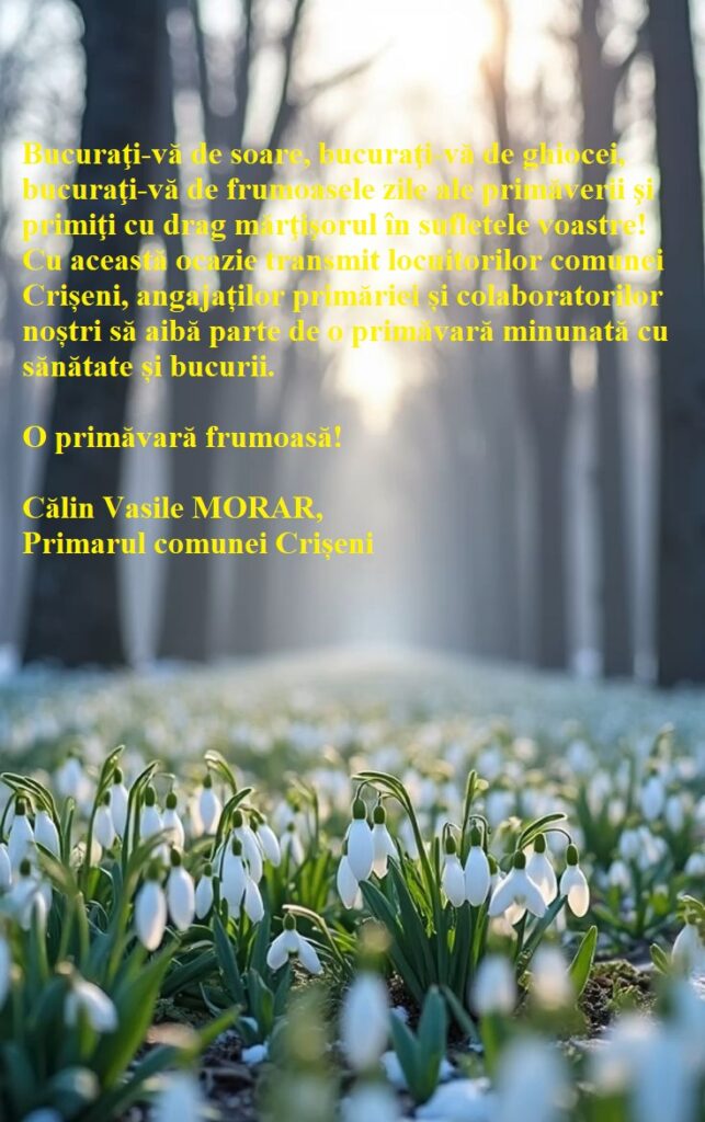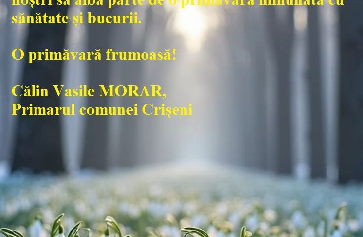 Cu această ocazie transmit locuitorilor comunei Crișeni, angajaților primăriei și colaboratorilor noștri să aibă parte de o primăvară minunată cu sănătate și bucurii.