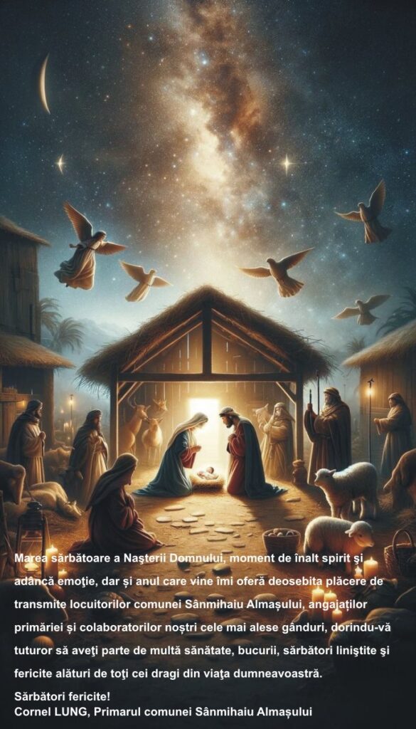 Marea sărbătoare a Naşterii Domnului, moment de înalt spirit şi adâncă emoţie, dar și anul care vine îmi oferă deosebita plăcere de transmite locuitorilor comunei Sânmihaiu Almașului, angajaților primăriei și colaboratorilor noștri cele mai alese gânduri, dorindu-vă tuturor să aveţi parte de multă sănătate, bucurii, sărbători liniştite şi fericite alături de toţi cei dragi din viaţa dumneavoastră.
