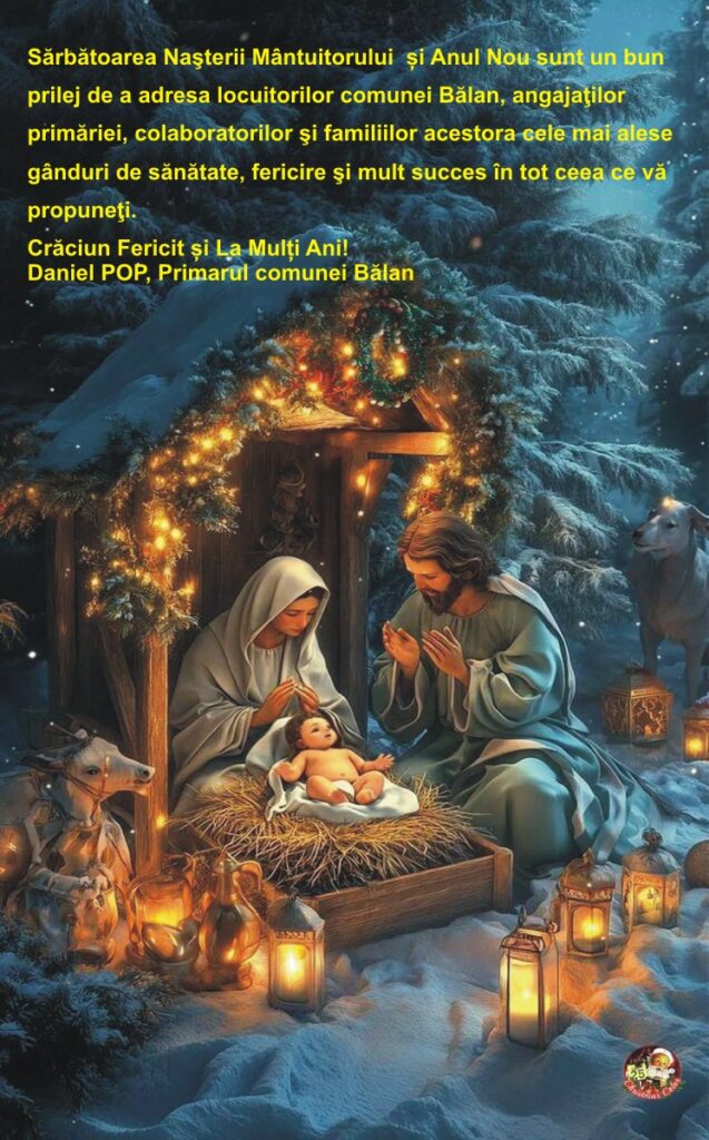 Sărbătoarea Naşterii Mântuitorului și Anul Nou sunt un bun prilej de a adresa locuitorilor comunei Bălan, angajaţilor primăriei, colaboratorilor şi familiilor acestora cele mai alese gânduri de sănătate, fericire şi mult succes în tot ceea ce vă propuneţi.