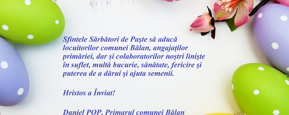 Sfintele Sărbători de Paşte să aducă locuitorilor comunei Bălan, angajaților primăriei, dar și colaboratorilor noștri linişte în suflet, multă bucurie, sănătate, fericire şi puterea de a dărui şi ajuta semenii.