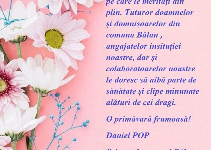 În acest început de primăvară vin din nou cu cele mai sincere felicitări pe care le meritați din plin. Tuturor doamnelor și domnișoarelor din comuna Bălan , angajatelor insituției noastre, dar și colaboratoarelor noastre le doresc să aibă parte de sănătate și clipe minunate alături de cei dragi.