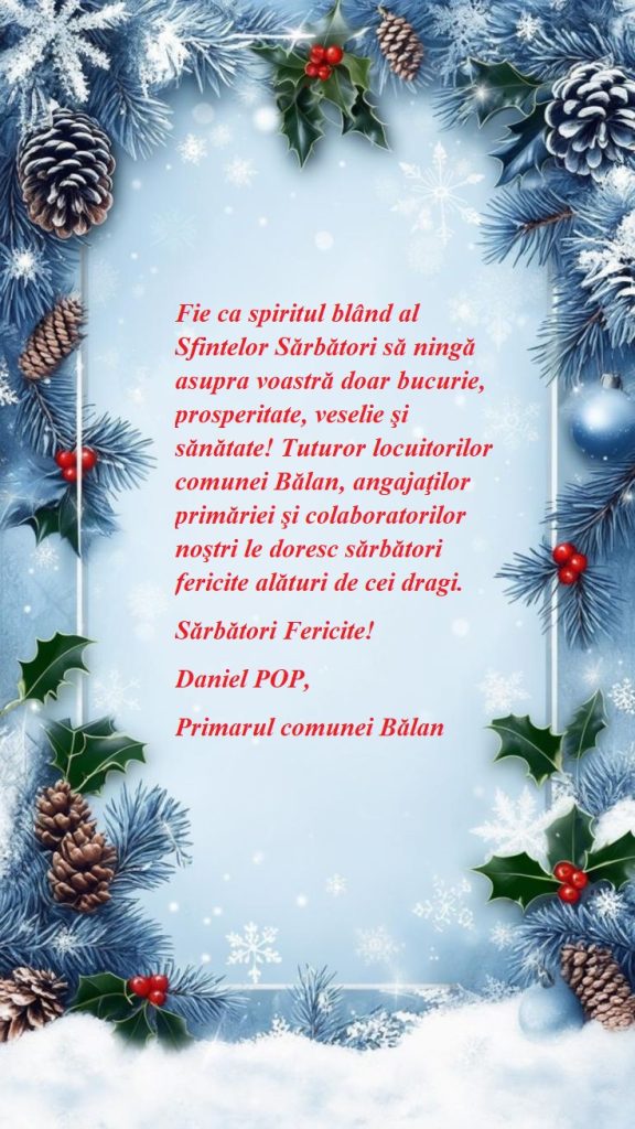 Fie ca spiritul blând al Sfintelor Sărbători să ningă asupra voastră doar bucurie, prosperitate, veselie şi sănătate! Tuturor locuitorilor comunei Bălan, angajaţilor primăriei şi colaboratorilor noştri le doresc sărbători fericite alături de cei dragi.