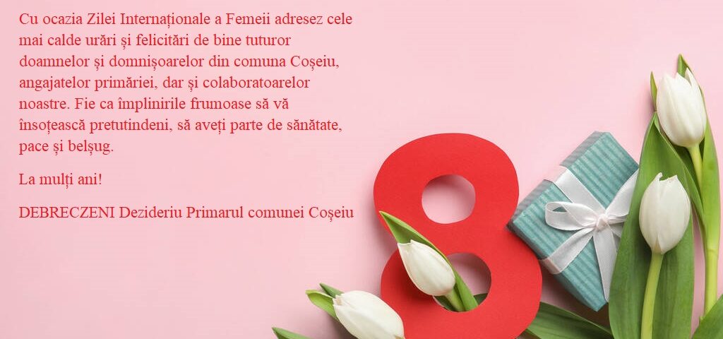 Cu ocazia Zilei Internaționale a Femeii adresez cele mai calde urări și felicitări de bine tuturor doamnelor și domnișoarelor din comuna Coșeiu, angajatelor primăriei, dar și colaboratoarelor noastre. Fie ca împlinirile frumoase să vă însoțească pretutindeni, să aveți parte de sănătate, pace și belșug.