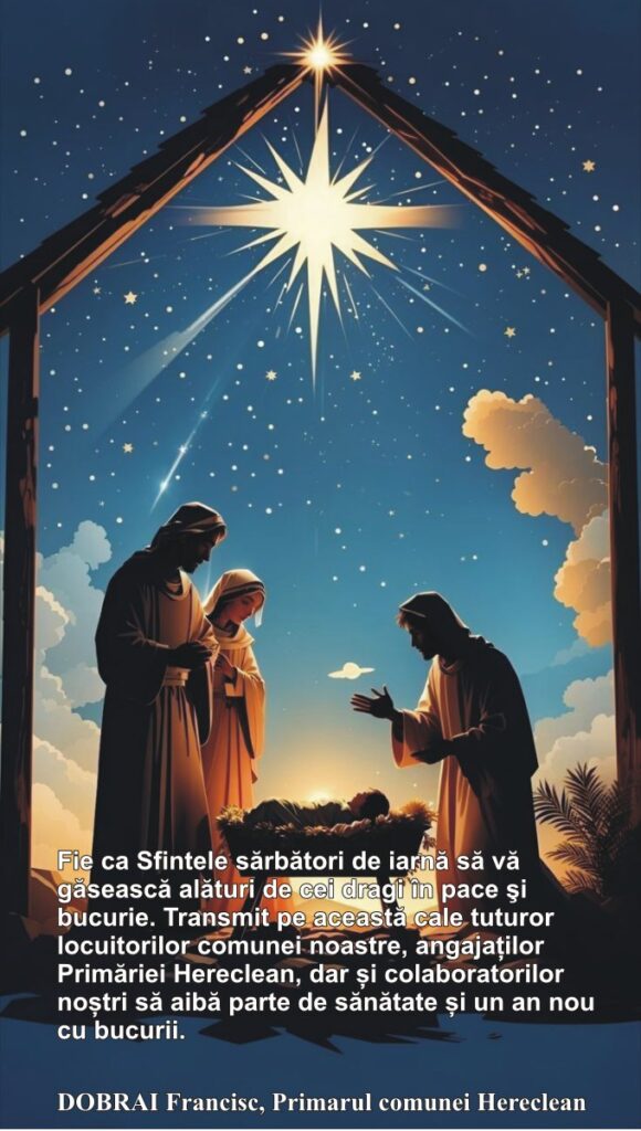 Fie ca Sfintele sărbători de iarnă să vă găsească alături de cei dragi în pace şi bucurie. Transmit pe această cale tuturor locuitorilor comunei noastre, angajaților Primăriei Hereclean, dar și colaboratorilor noștri să aibă parte de sănătate și un an nou cu bucurii.