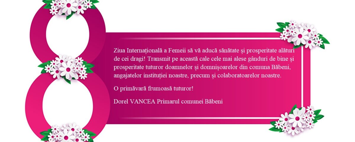 Ziua Internațională a Femeii să vă aducă sănătate și prosperitate alături de cei dragi! Transmit pe această cale cele mai alese gânduri de bine și prosperitate tuturor doamnelor și domnișoarelor din comuna Băbeni, angajatelor instituției noastre, precum și colaboratoarelor noastre.
