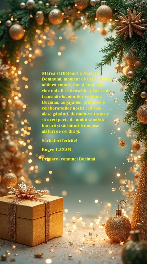 Marea sărbătoare a Naşterii Domnului, moment de înalt spirit şi adâncă emoţie, dar și anul care vine îmi oferă deosebita plăcere de transmite locuitorilor comunei Buciumi, angajaților primăriei și colaboratorilor noștri cele mai alese gânduri, dorindu-vă tuturor să aveţi parte de multă sănătate, bucurii și sărbători frumoase alături de cei dragi.