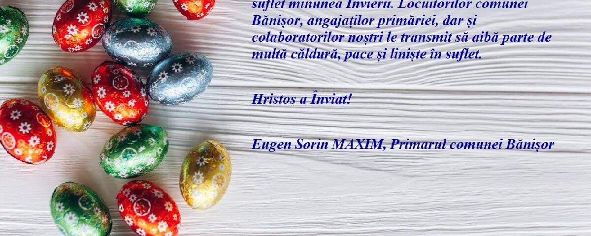 Fie ca Sfânta Sărbătoare de Paști să vă coboare în suflet minunea Învierii. Locuitorilor comunei Bănișor, angajaților primăriei, dar și colaboratorilor noștri le transmit să aibă parte de multă căldură, pace și liniște în suflet.